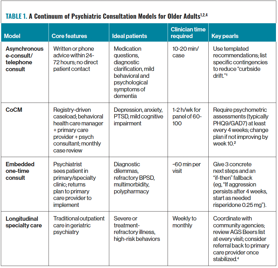 A collaborative care model (CoCM) and its related approaches offer a scalable answer. Initially developed at the University of Washington, the original CoCM blends measurement-based treatment, team-based case review, and steppedcare principles. This approach doubled remission rates for late-life depression while reducing overall costs compared with usual care.2Evidence from the landmark IMPACT trial in older adults highlights the long-term effectiveness of the CoCM, with benefits sustained for up to 5 years.3 Table 1 shows a potential continuum of psychiatric consultation models for older adults.1,2,4