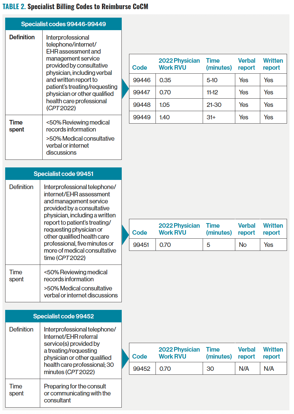 Medicare now reimburses CoCM under Current Procedural Terminology (CPT) 99492-99494 (and Healthcare Common Procedure Coding System G2214) when 36 minutes or more per month of care manager time are documented. In addition, billing codes are available for e-consultations (CPT 99451, 99452) and telephone consultations (CPT 9946-99449).5 Table 2 shows specialist codes.